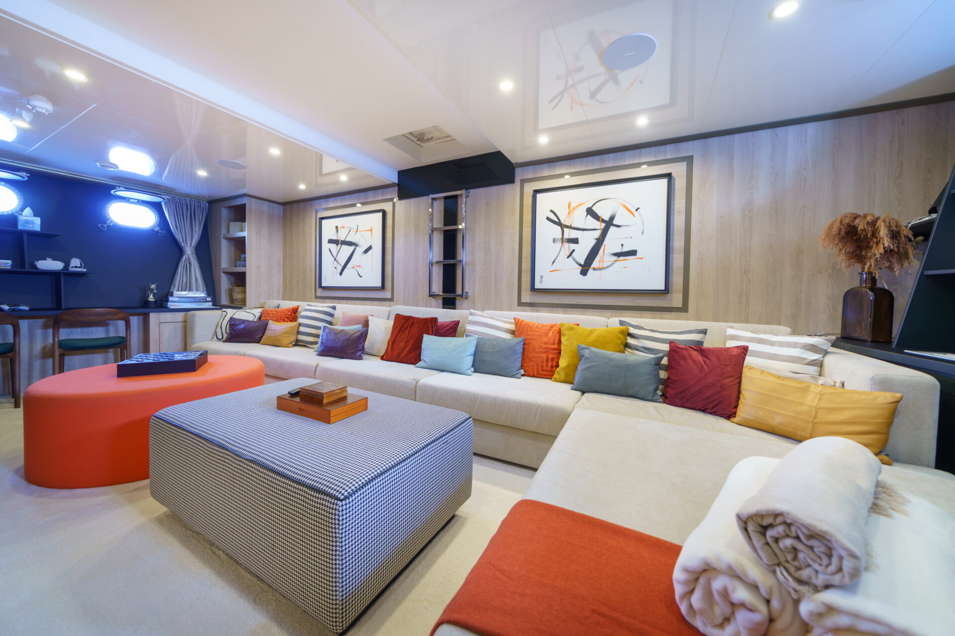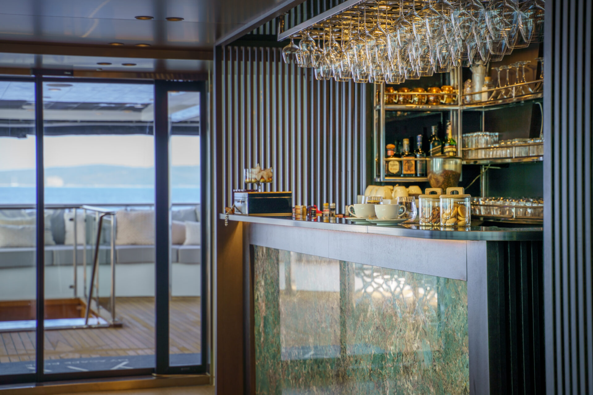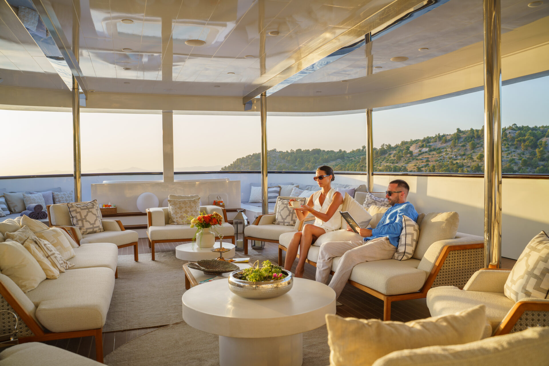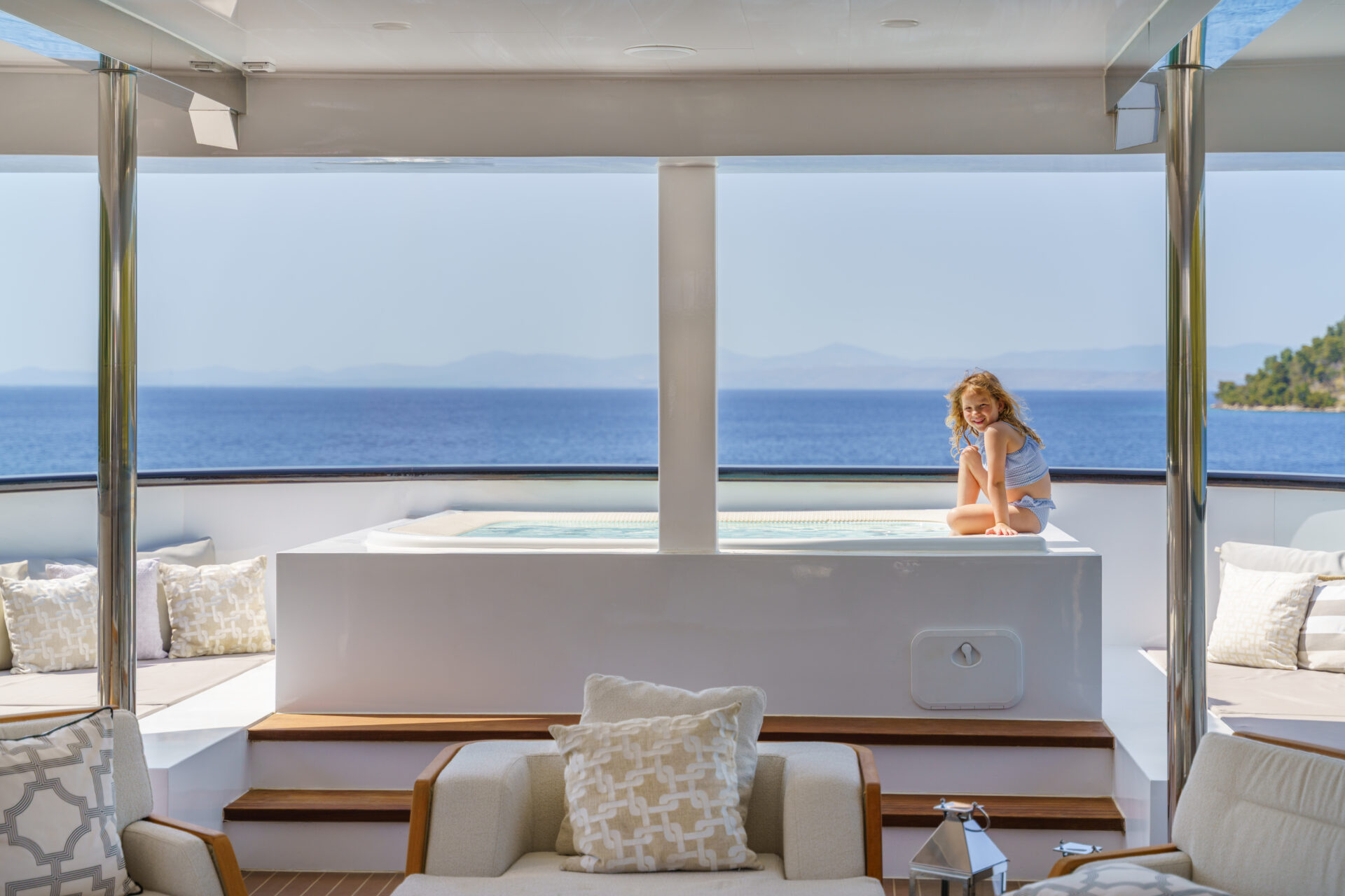 • Expansive sundeck featuring a forward Jacuzzi, outdoor kitchen, sun loungers and shaded seating