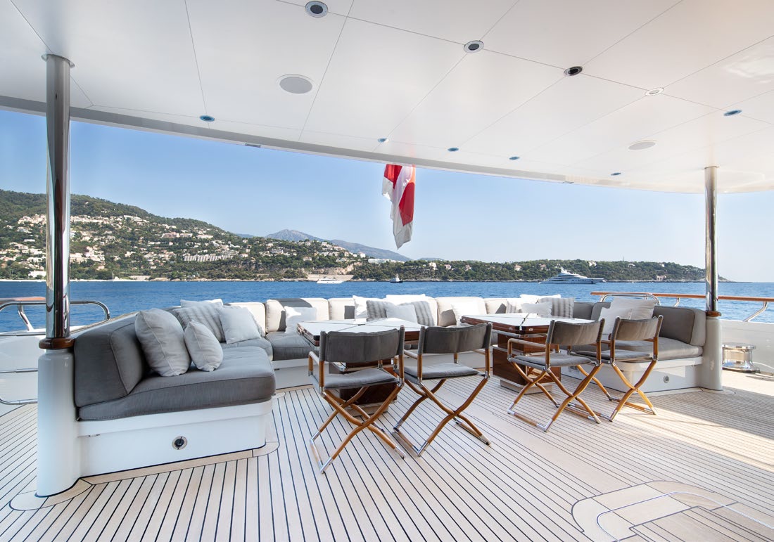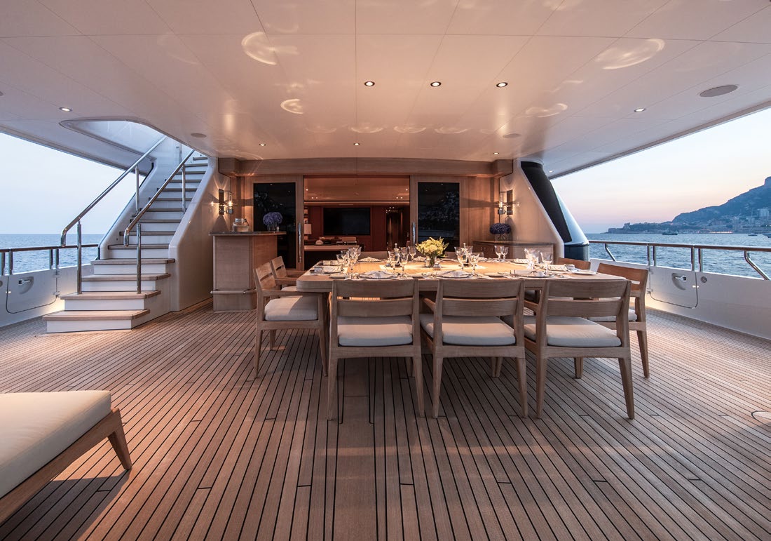 • Bridge deck dining enhanced with windbreaks, ceiling heaters, and an aft fire pit lounge