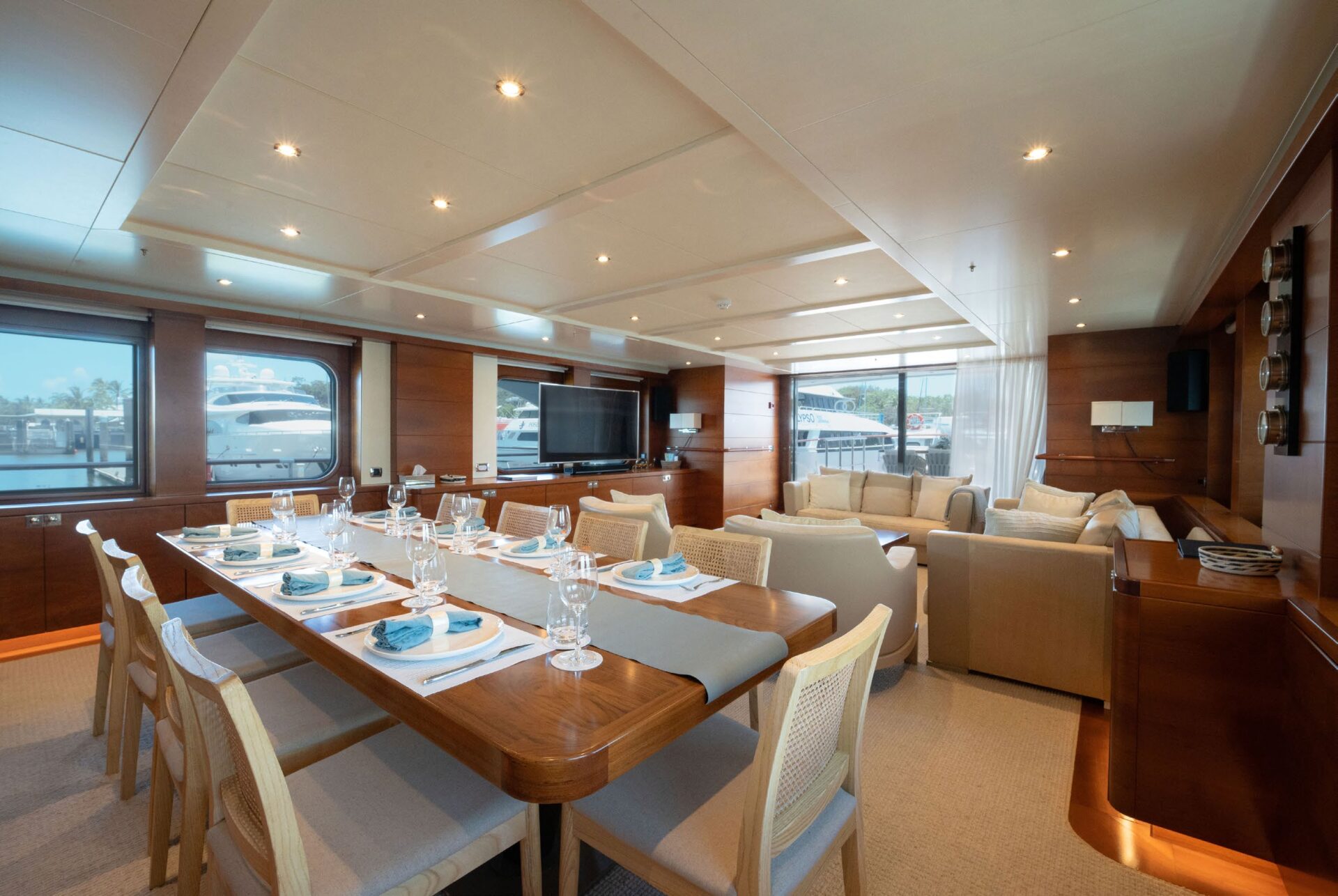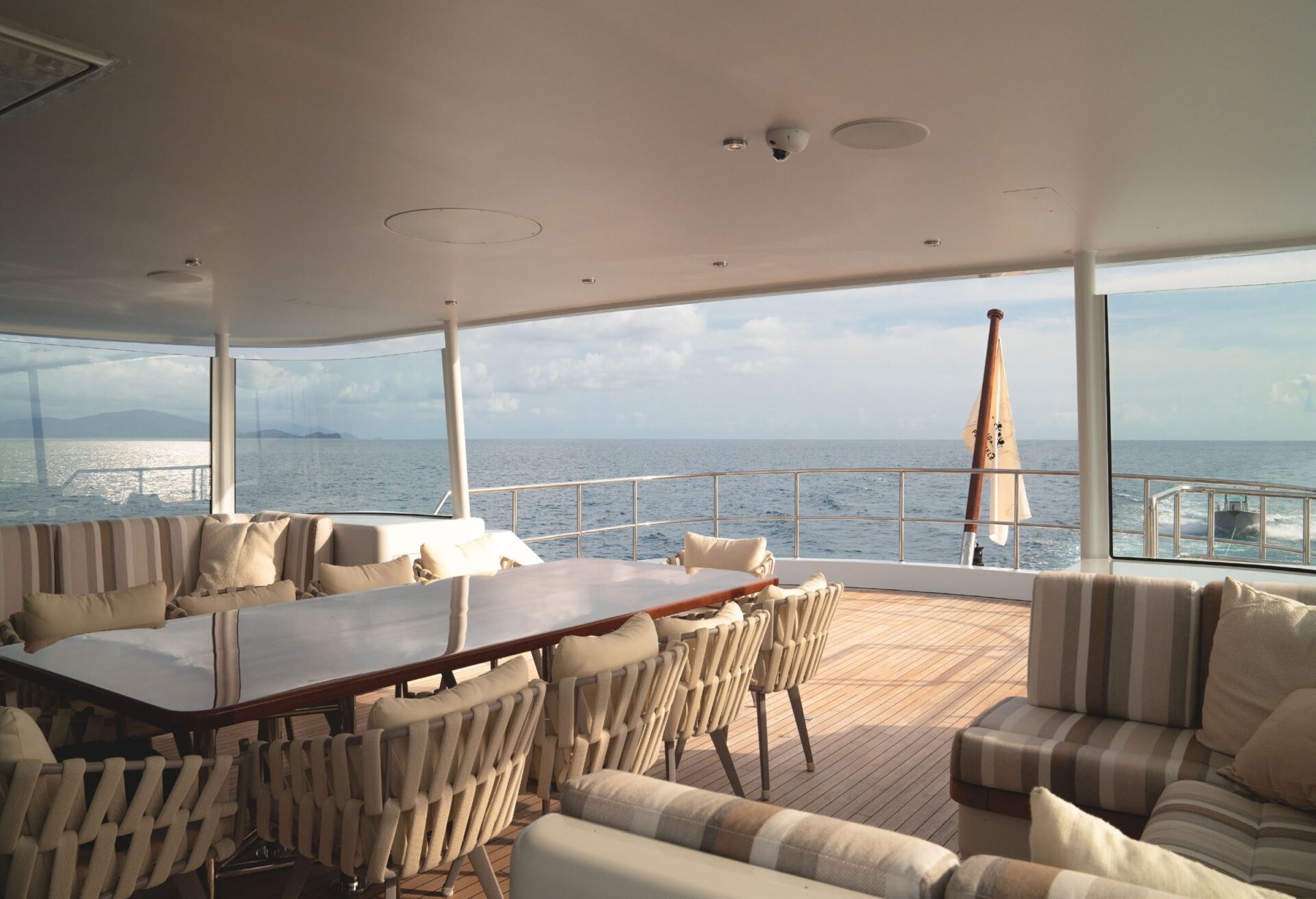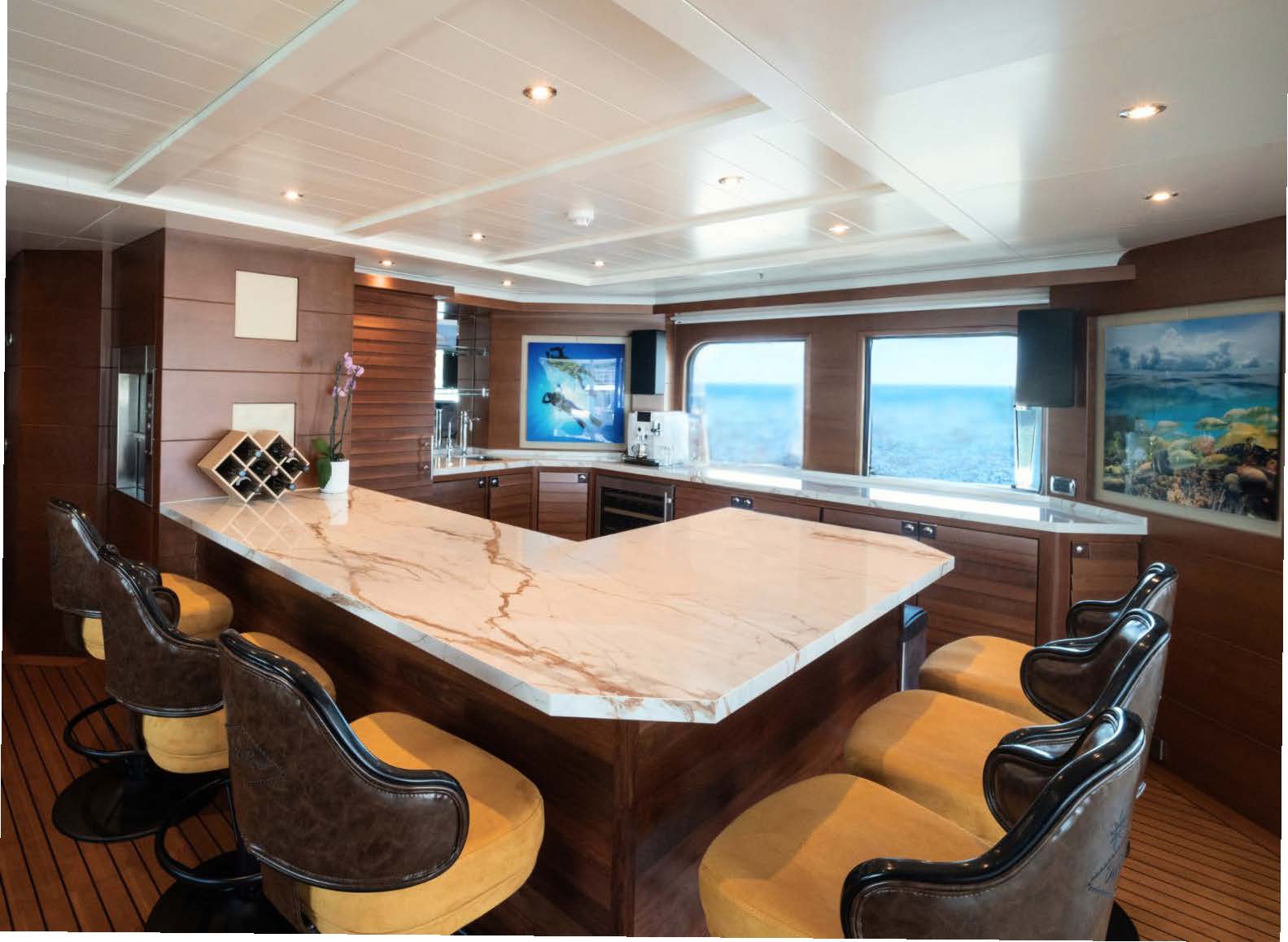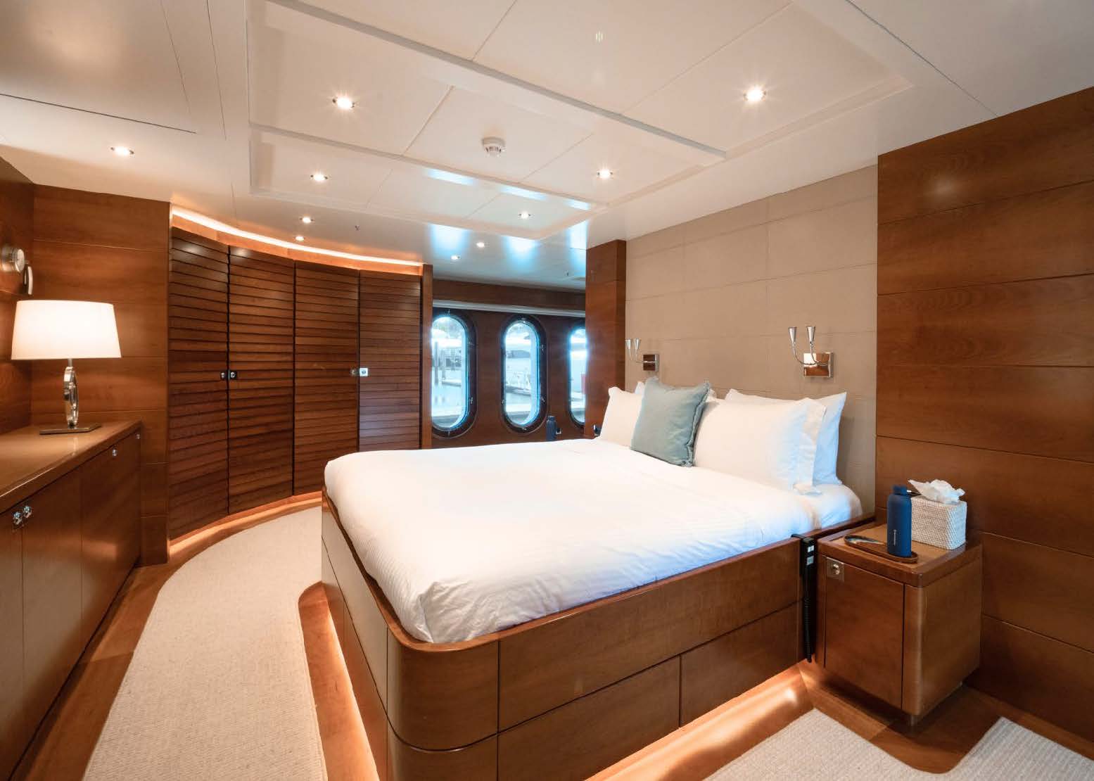 • Accommodates 10–12 guests in five cabins, including a full-beam main-deck master suite with private office