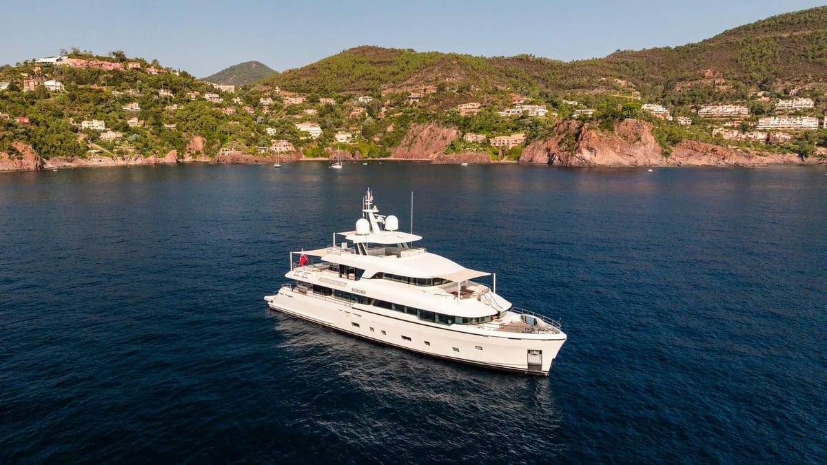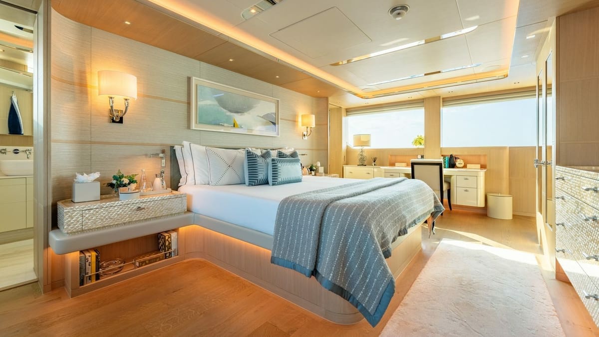 • Five-stateroom layout for 12 guests, supported by seven crew