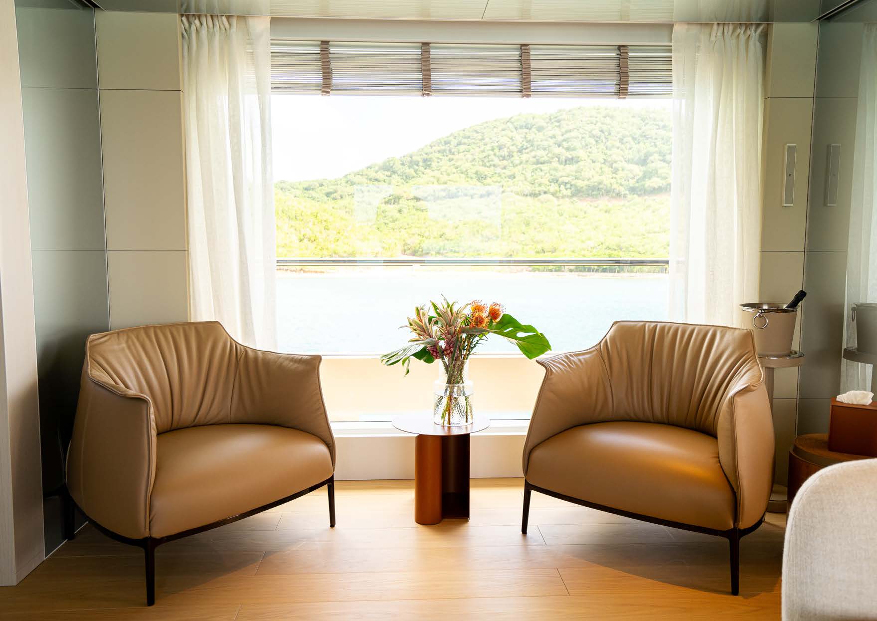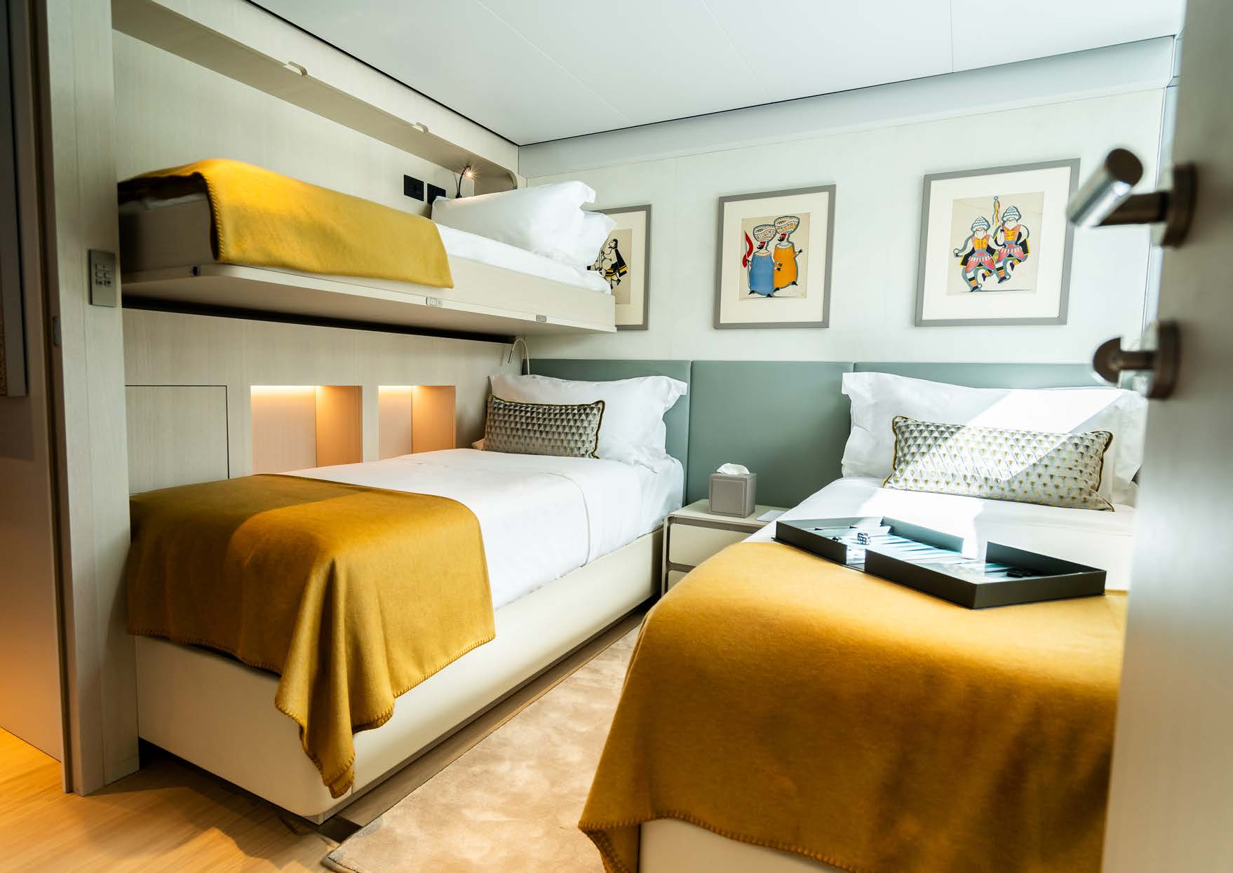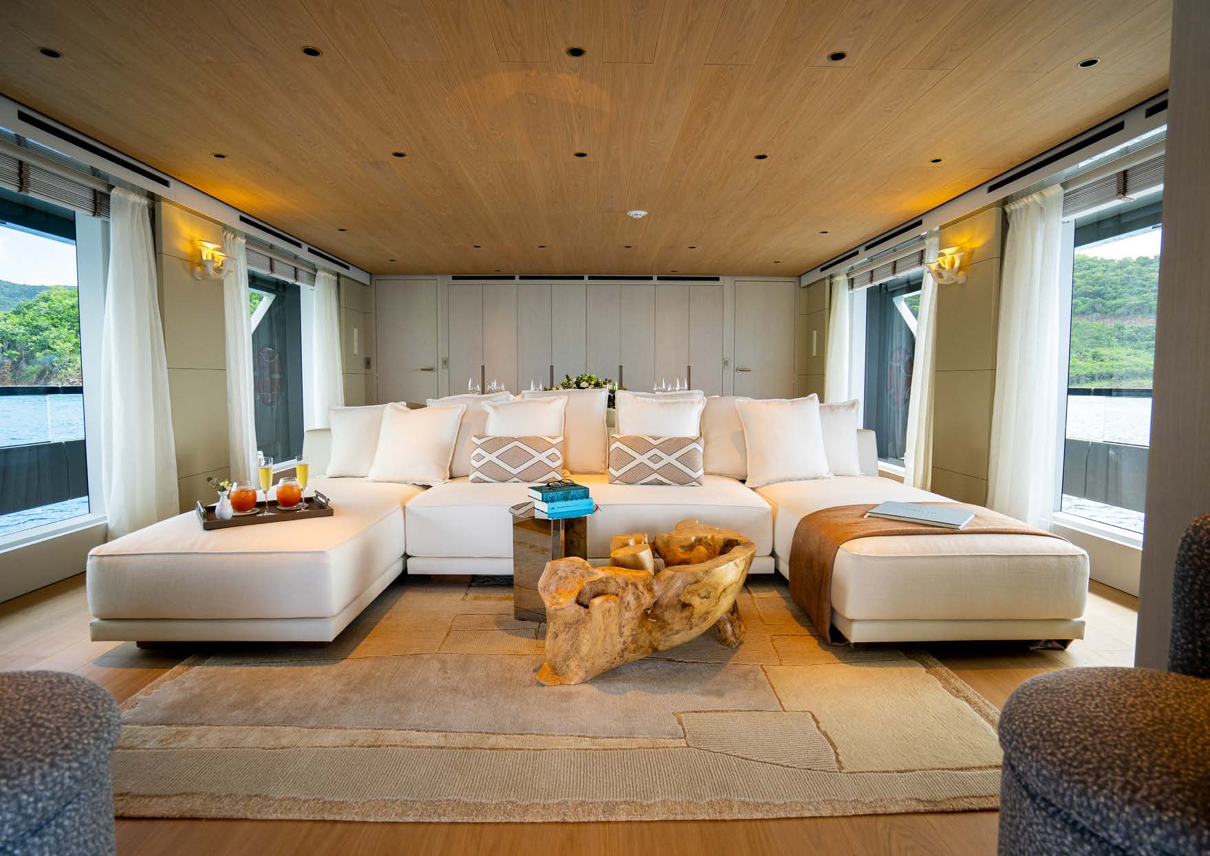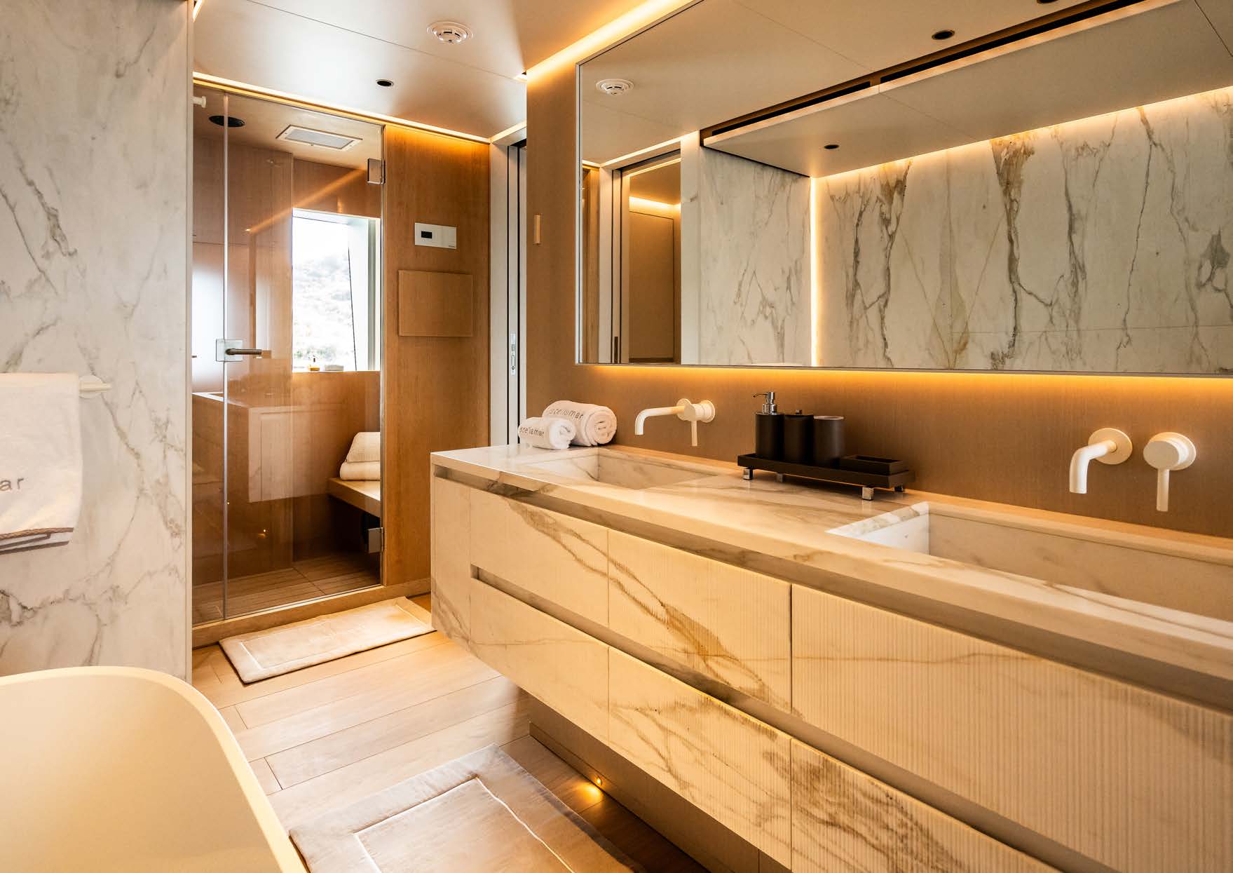 • Five guest cabins accommodate up to 12 guests, including a main-deck owner’s suite featuring an integrated infrared sauna