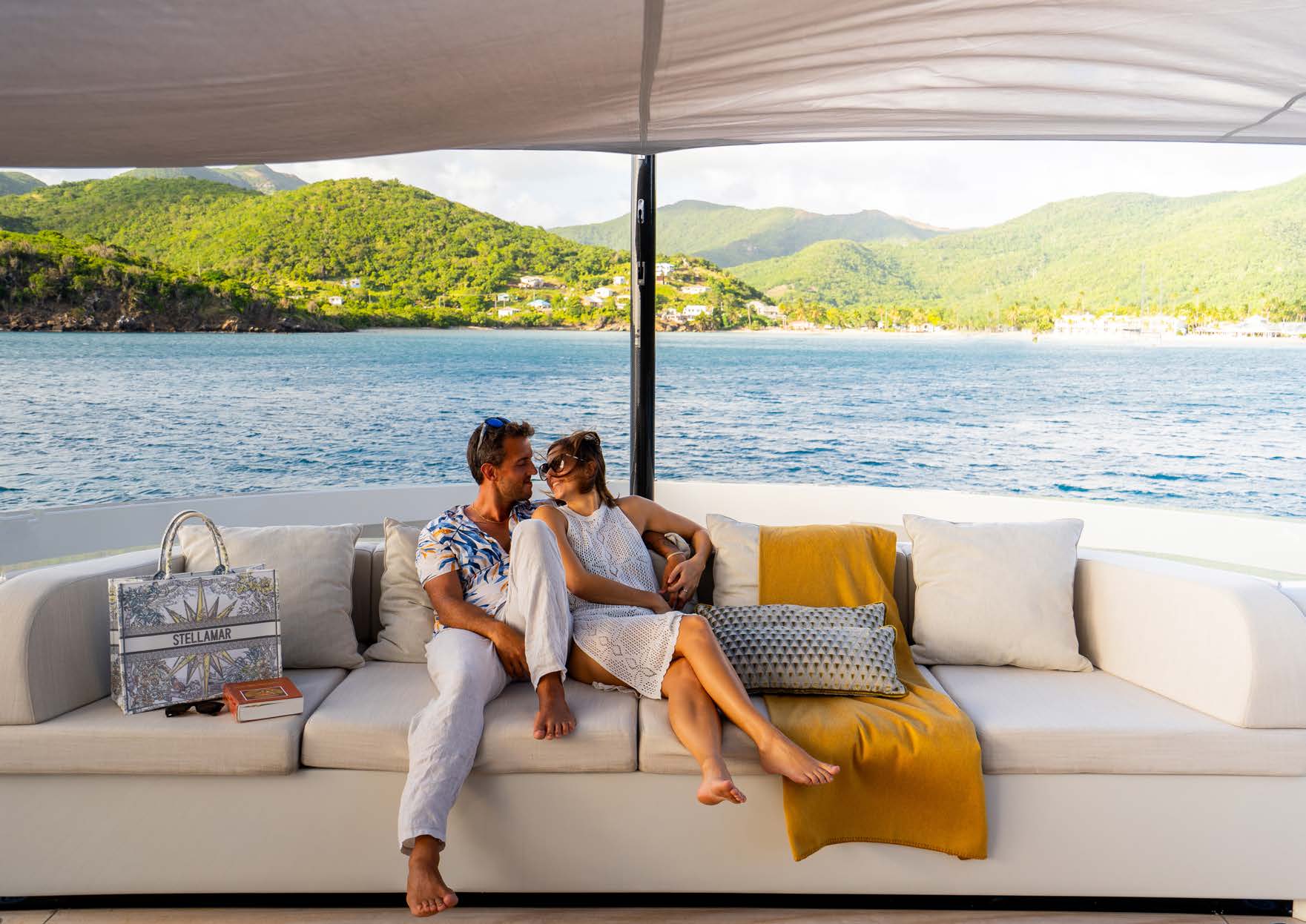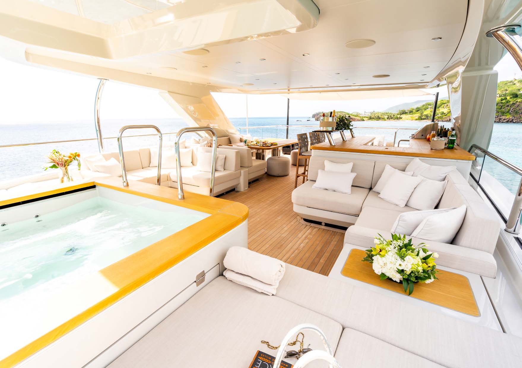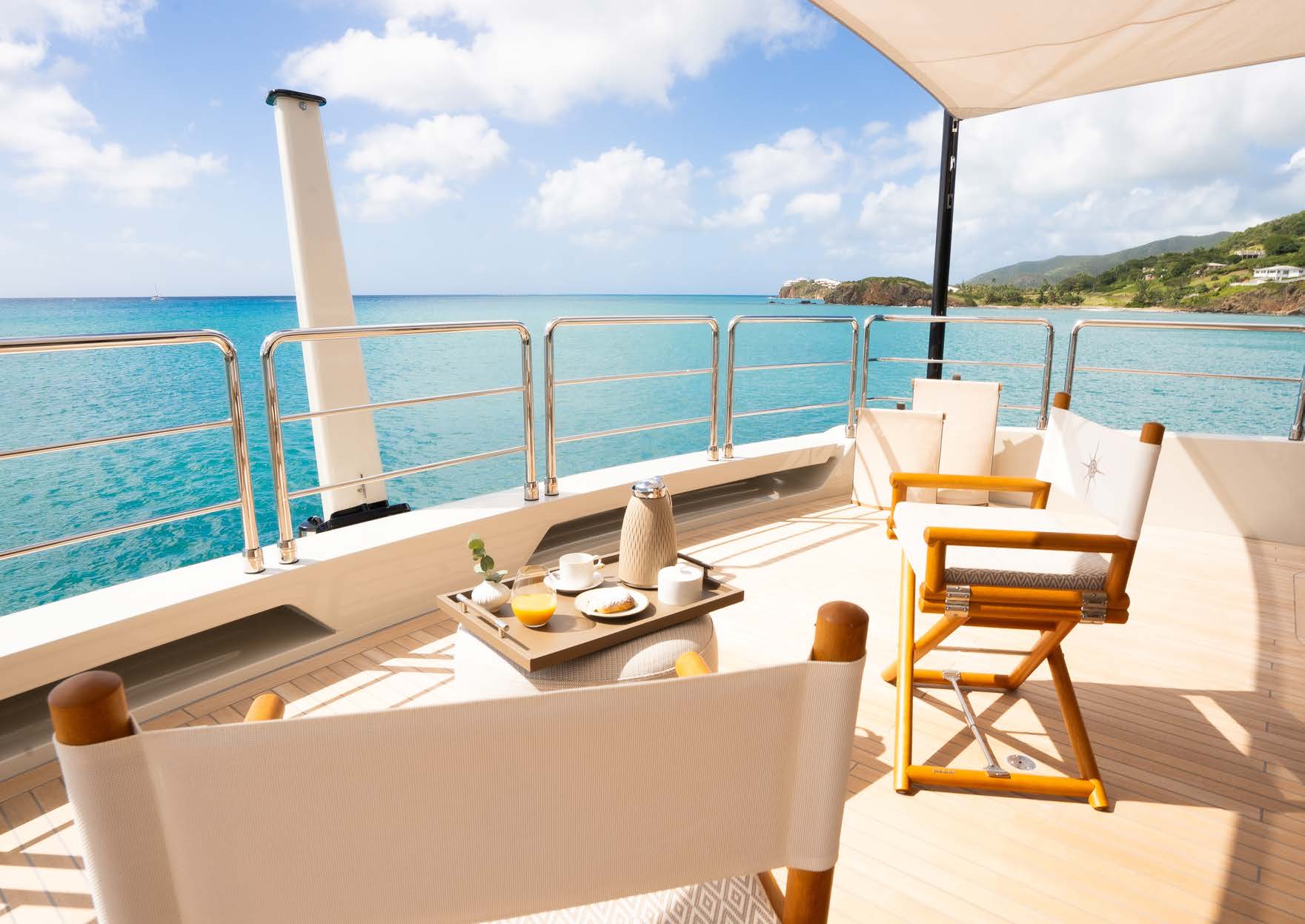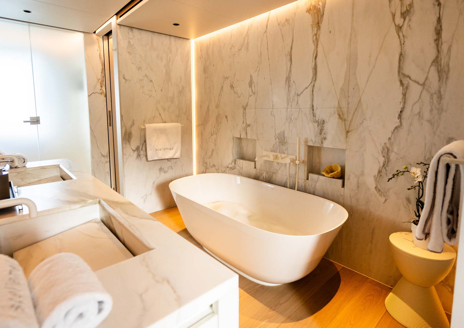 • Five guest cabins accommodate up to 12 guests, including a main-deck owner’s suite featuring an integrated infrared sauna