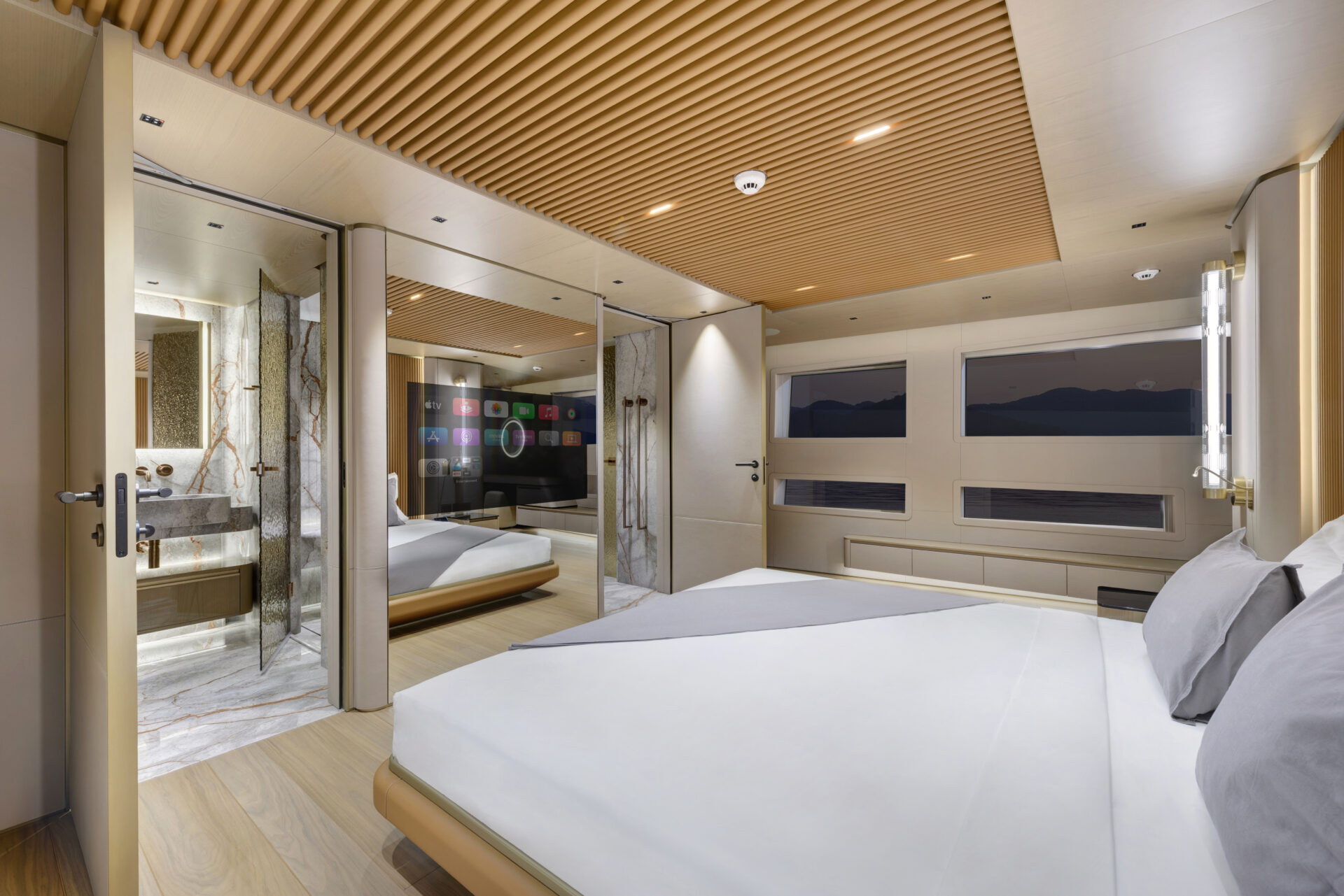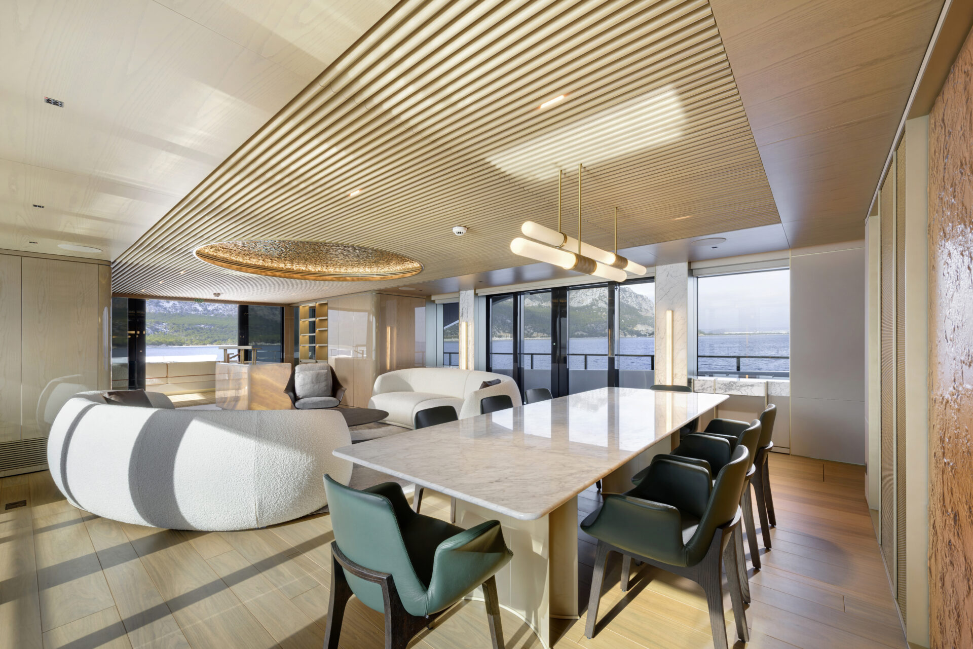 Gym with incredible views through full glass sliding doors adjacent to swim platform
